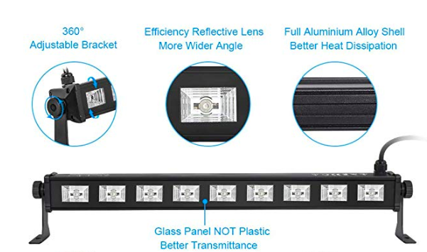 tem model number 9LED UV blacklights Assembled Height 1.57 inches Assembled Length 14.37 inches Assembled Width 1.57 inches Color 9LEDs Black Lights Shape oblong Material Metal Voltage 110 volts Specific Uses Indoor use only Fixture Features 2-way switching Power Source corded-electric Batteries Included? No Batteries Required? No Type of Bulb LED Wattage 27.00 Bulb Features Instant On