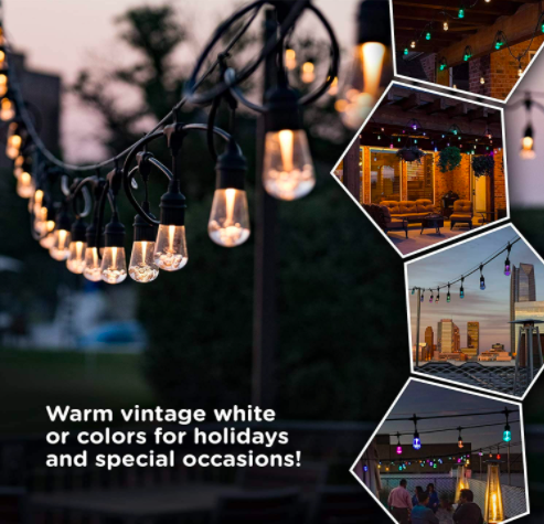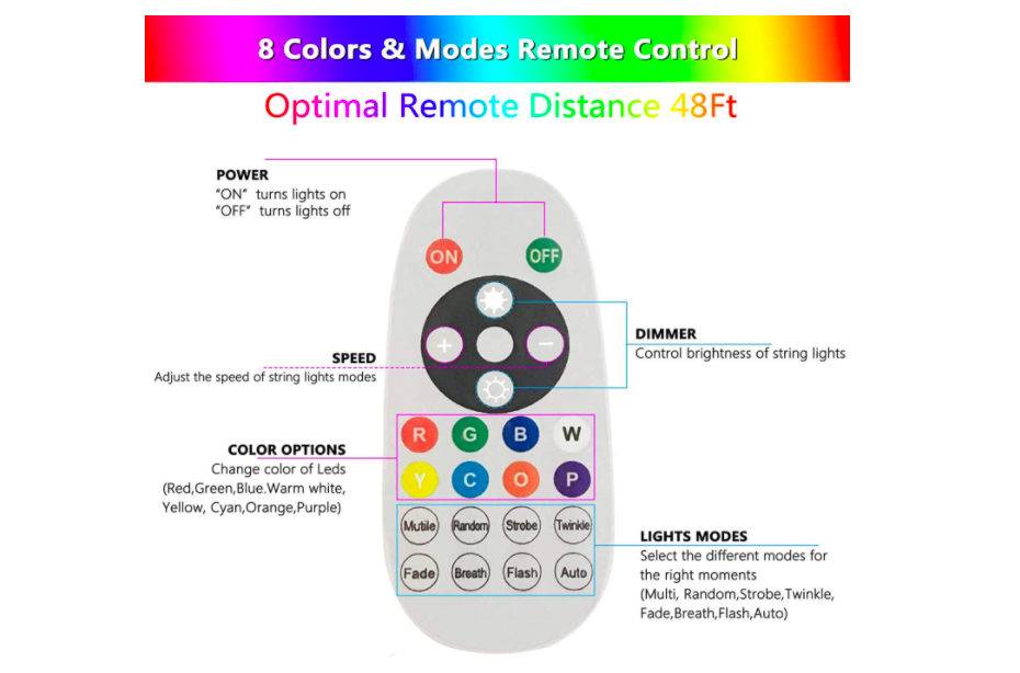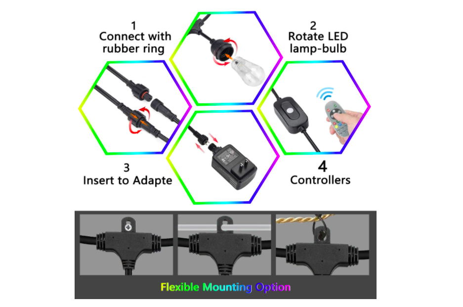 Color del cable Negro Voltaje 100V-220V Especificaciones: Longitud total (de extremo a extremo): 24 pies. Cantidad de bombillas: 12 bombillas. Tipo de foco: 0,4 W RGB. Distancia entre foco: 3 pies. Casquillo: 12 enchufes. Voltaje de entrada: CA 100 – 120 V 50/60 Hz 1000 mA. Voltaje de salida: 5 V/4,2 A. Material: plástico, latón, goma. El paquete incluye: 1 mando a distancia inalámbrico. 1 cadena de 10 focos RGB de 10 metros . 10 FOCOS RGB. 1 manual de instrucciones (idioma español no garantizado). 1 adaptador de 120 V/5 V. Consejos cálidos: >La distancia de control del regulador puede verse afectada por la obstrucción de los obstáculos o la batería baja, así que por favor intente hacia diferentes ángulos, si el mando a distancia no responde. Los foco son extraíble y reemplazable. Distancia de control remoto: 5 metros . > luces exteriores de color. 17 modos de color y conectable: las luces de cadena Edison cambian de color tienen 13 colores puros (rojo, verde, azul, blanco, amarillo, morado, naranja…) y 4 modos de luz (LASH, STROBE, FADE, SMOOOTH), rojo/verde – tema de Navidad, rojo/blanco – día de San Valentín, rojo/blanco/azul – 4 de julio, rojo/blanco/azul/verde – colores básicos, blanco/azul – Hanukkah, amarillo/azul – colores escolares/festivos, etc. conectar más luces de cadena para decorar más áreas. Regulable y control remoto: el mando a distancia con pantalla táctil, el modo de función es simple y claro con la señal de transmisión inalámbrica se controla en ángulo completo.Puedes controlar la cadena de luces LED desde 15 m de distancia incluso si estás en el interior en días lluviosos, y puedes ajustar el brillo de la luz que deseas en cualquier momento. Resistente a la intemperie: las luces de color al aire última intervención hechas de cable de alta calidad, conector impermeable y enchufes soportarán el sol, temperaturas extremas y inclemencias del tiempo, lo que proporcionará años de disfrute. Luz decorativa ideal para exteriores e interiores: la cadena de luces creará un ambiente perfecto para tu patio, porche, jardín, pérgola, cenador, etc. incluso más como iluminación y decoración de distrito de negocios, como cafetería, bar, restaurante, oficina. Paquete y ayuda: el paquete contiene 10 Focos, 1 cadena de luces de 10 m con 10 enchufes y guía de usuario, mando a distancia PLUG de México Socket base E26/E27 Application outdoor/indoor