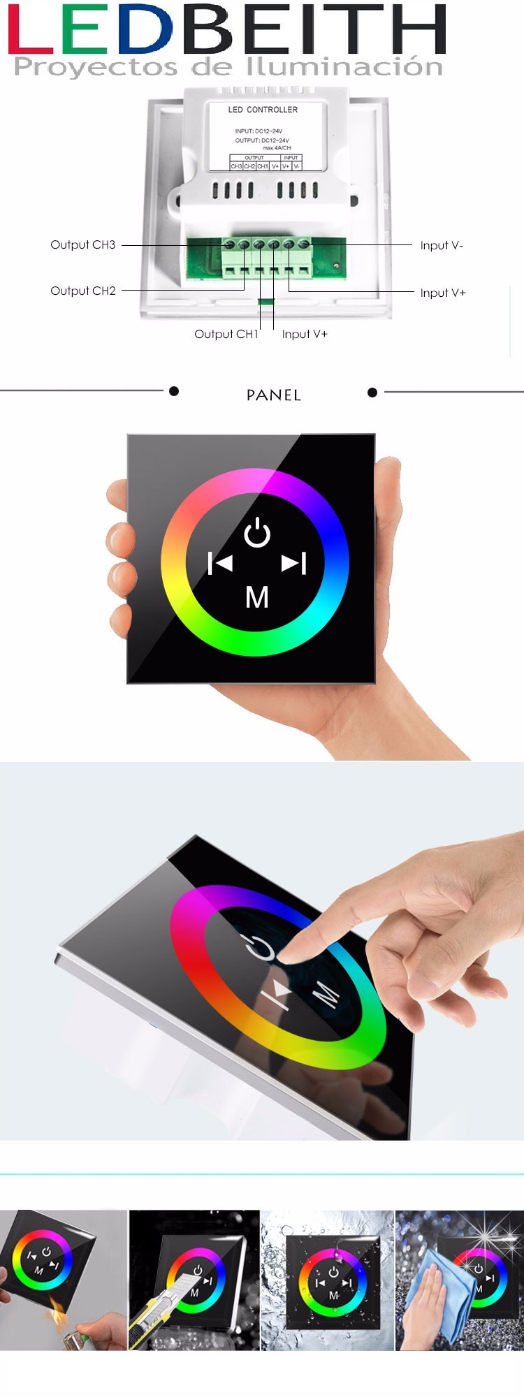 Controlador empotrable RGB de panel táctil de gran calidad y cuidado diseño, incorpora en el frontal un fino panel de vidrio con alta precisión táctil con su nuevo chip de control que aumenta la sensibilidad al tacto y reduce el encendido por error. Ideal para el control de la iluminación de control de temperatura de color de las tiras RGB. Podrá regular la temperatura de color desde blanco cálido a blanco frío, pasando por las tonalidades intermedias. Incluye controles de encendido / apagado, con solo una pulsación puede cambiar el color, o la intensidad o seleccionar el efecto deseado. Con el nuevo controlador empotrable, tendrá una mayor facilidad de uso su instalación LED RGB y encajará a la perfección en cualquier decoración. Especificaciones técnicas: Voltaje: DC 12/24V. Canal de salida: tres canales. Intensidad admisible: 4 Amperios por canal. Potencia de salida: 96W (entrada de 12V) o 192W (entrada de 24V). Características: Compatible solamente con tiras LED que contengan mitad de LEDs RGB. 17 modos predefinidos para subir o bajar la tonalidad de color. Mantiene la memoria si hay algún corte de energía. Totalmente táctil en todo el anillo de selección de color.
