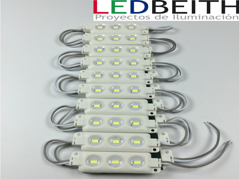 Voltaje de operación DC 12V Consumo 1.2W Tipo de LED SMD 5730 SAMSUNG Cantidad de Leds 3 Ángulo de apertura 120° Flujo luminoso 120 lumenes por módulo Vida útil 50,000 horas (puede variar) Materiales Plástico ABS Grado de Protección IP IP67